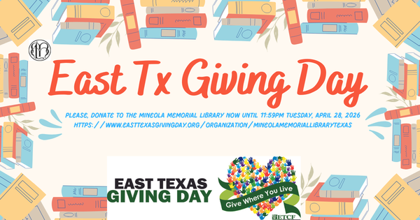 East Tx Giving Day fundraising campaign. Donate through the website: easttexasgivingday.org/organization/mineolamemoriallibrarytexas or click on the picture to go directly to the link. Your generosity is appreciated!